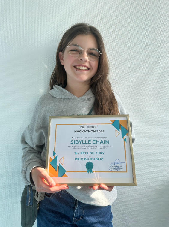 Cette année, trois de nos ambassadeurs ont participé activement à ce hackathon. Parmi eux, Sibylle, élève de 303, s’est particulièrement illustrée. Avec son équipe, elle a remporté à la fois le Prix du Jury et le Prix du Public, une performance saluée par tous.