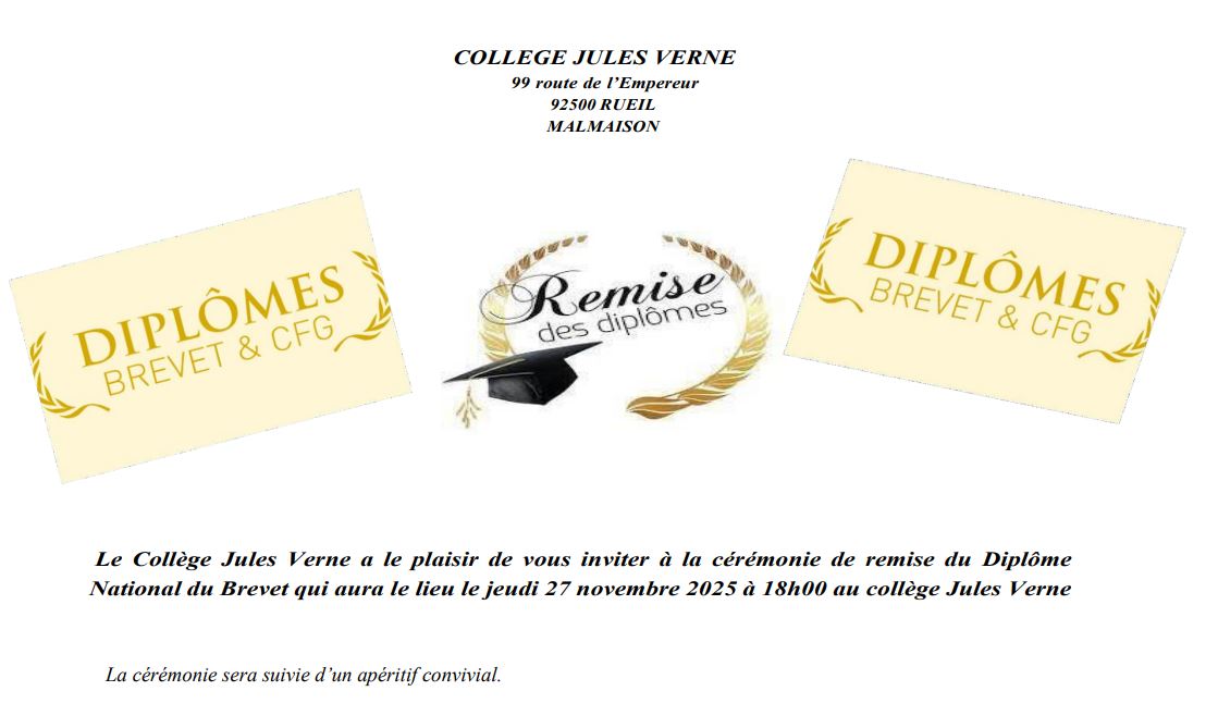 Le Collège Jules Verne aura le plaisir d’accueillir ses anciens élèves de troisième pour la cérémonie de remise du Diplôme National du Brevet, le jeudi 27 novembre 2025 à 18h00, au sein de l’établissement.